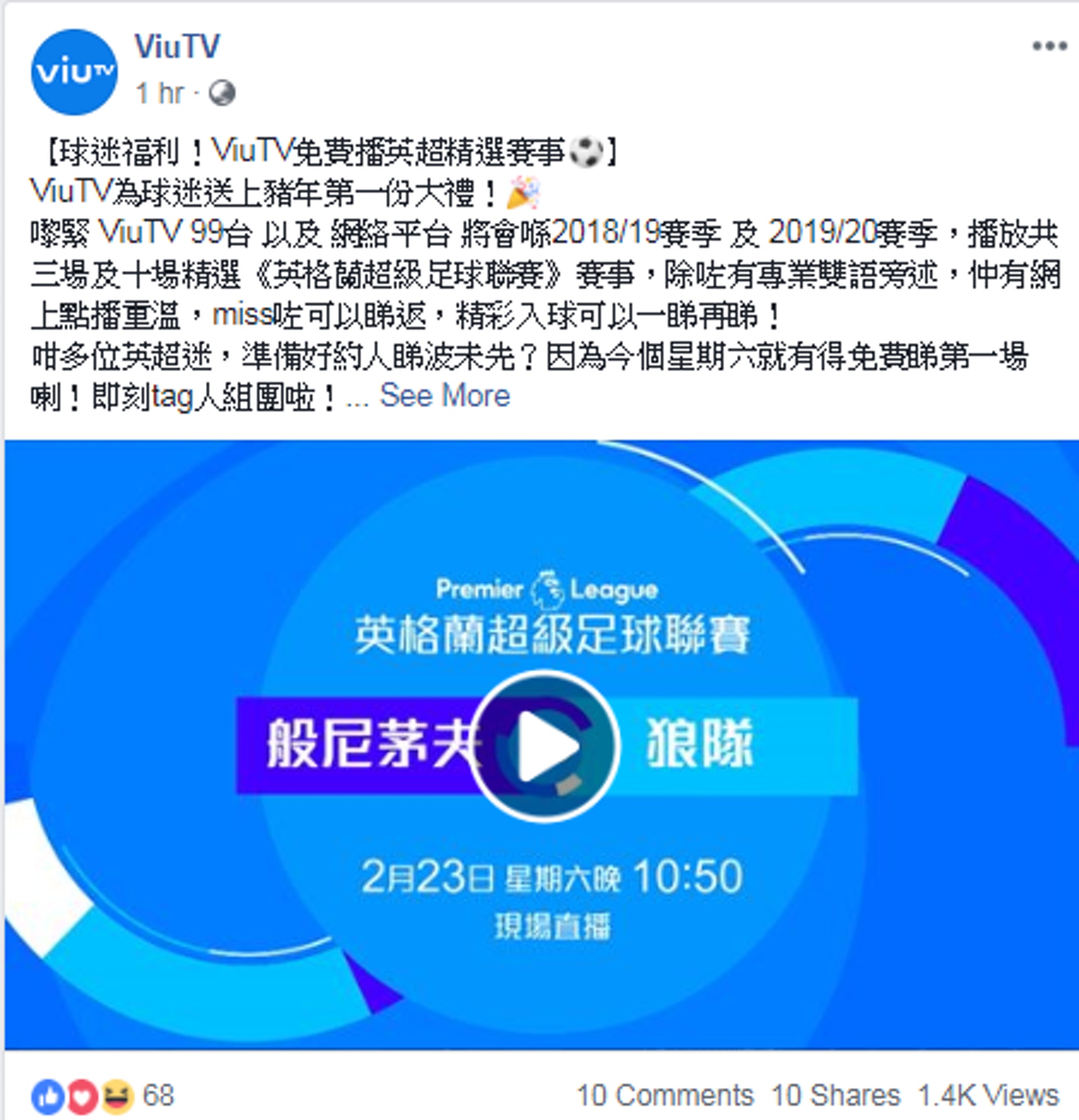 Viutv 1月精選英超賽事 李斯特城vs 修咸頓 護級大過天嘅修咸頓 將會迎戰李斯特城 Facebook