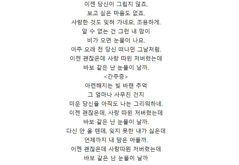 사랑한 것도 잊혀 가네요. 사랑한 것도 잊혀 가네요. 보고 싶은 마음도 없죠.
